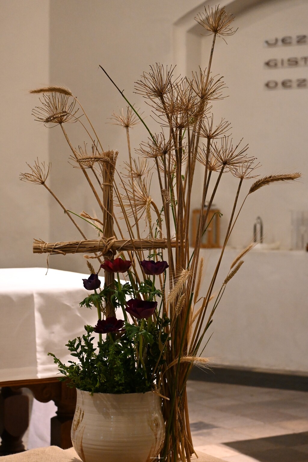 Bij Goede vrijdag hoort het kruis. De verticale lijnen symboliseren de verbinding met het spirituele, de vervulling. De horizontale lijn in het kruis het aardse leven dat door zal gaan zoals het zaad in de akker. De vijf paarse bloemen zijn het teken van lijden en rouw.