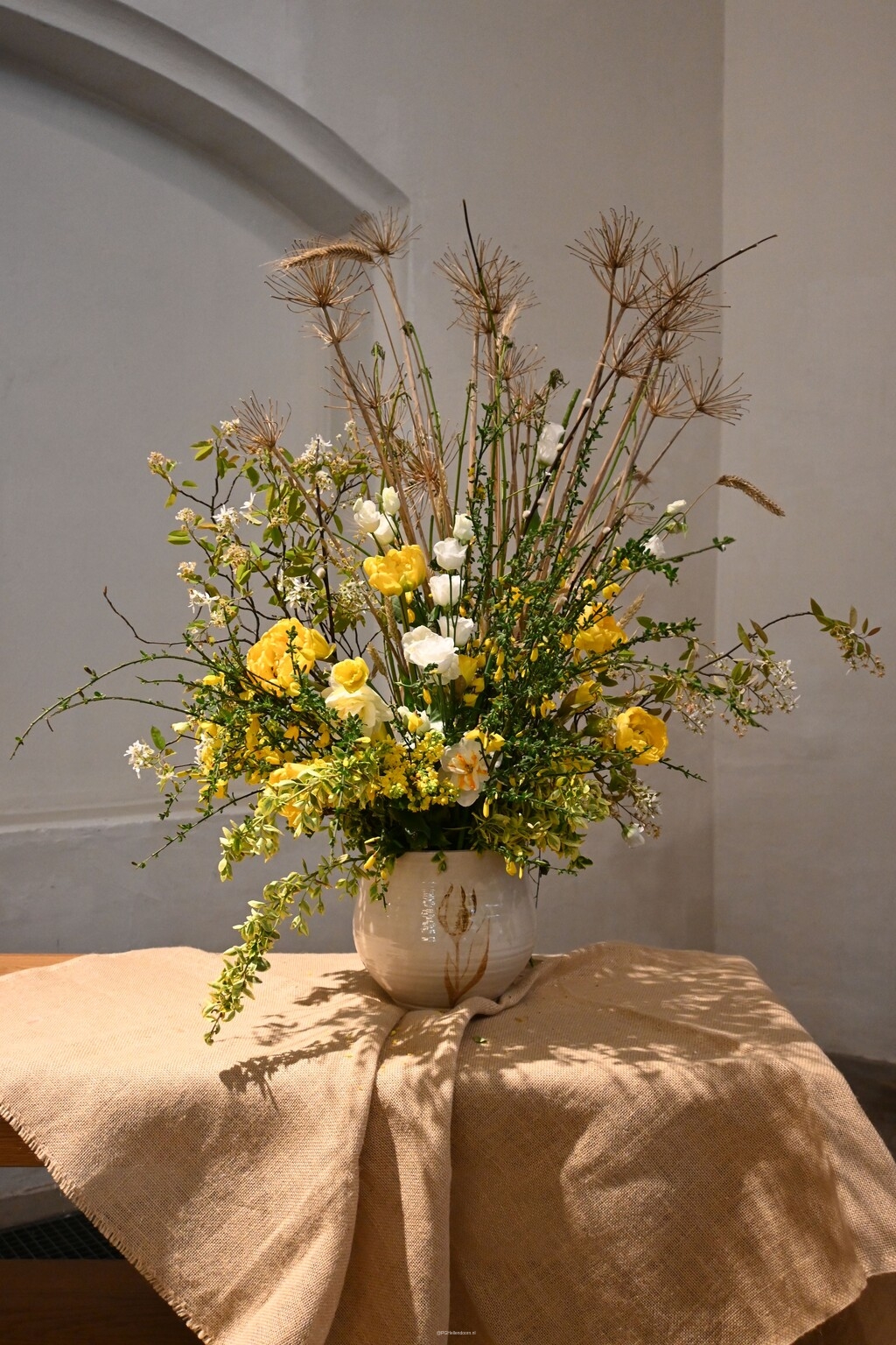 De schaal met doek herinnert ons aan de voetwassing: dienen.