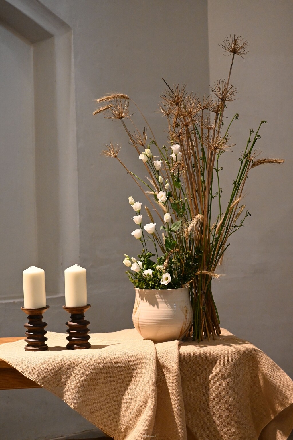 Het daglicht lonkt, de nieuwe dag breekt aan en de toekomst opent zich. Er komt licht. Het licht zien we in de brandende kaarsen.